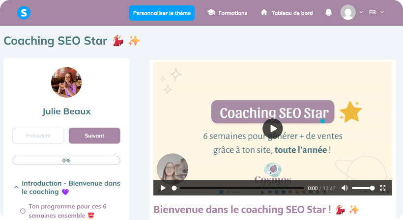 Le coaching SEO que je propose intègre une partie de formation en ligne (tu débloques chaque semaine des vidéos), mais tu bénéficies aussi d’un accompagnement individuel avec moi ! Chaque semaine, nous nous retrouvons pour une séance de coaching 1:1.