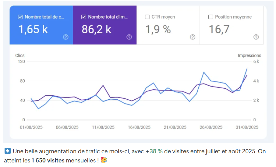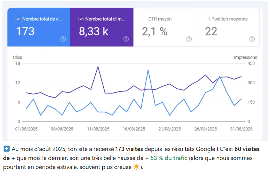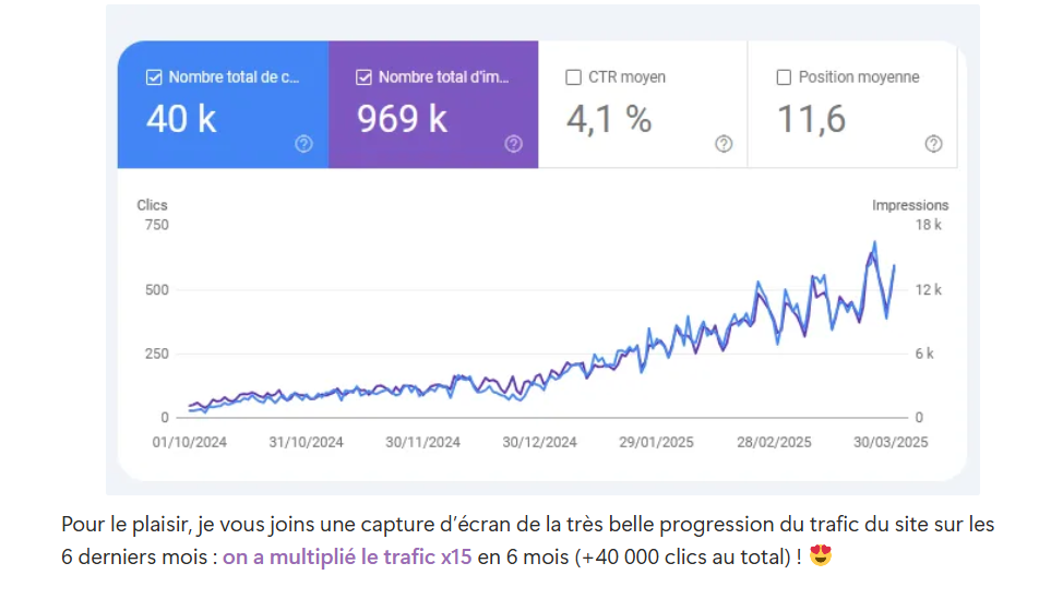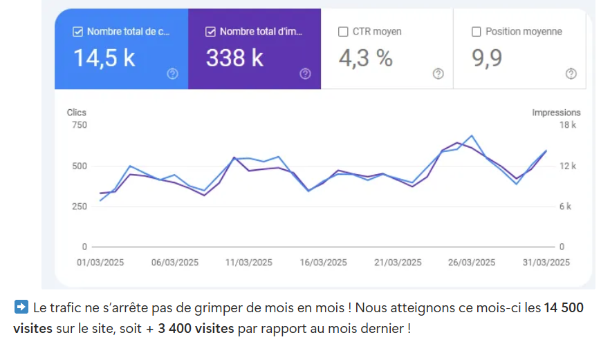 Ne crois pas que j’abandonne ton site internet dans la jungle Google dès sa publication. Que nenni ! J’assure 2 points de suivi du référencement naturel du site : un premier 3 mois après la mise en ligne des modifications et un deuxième 6 mois après. L’objectif ? M’assurer que notre stratégie porte ses fruits et réaliser des ajustements, si besoin.